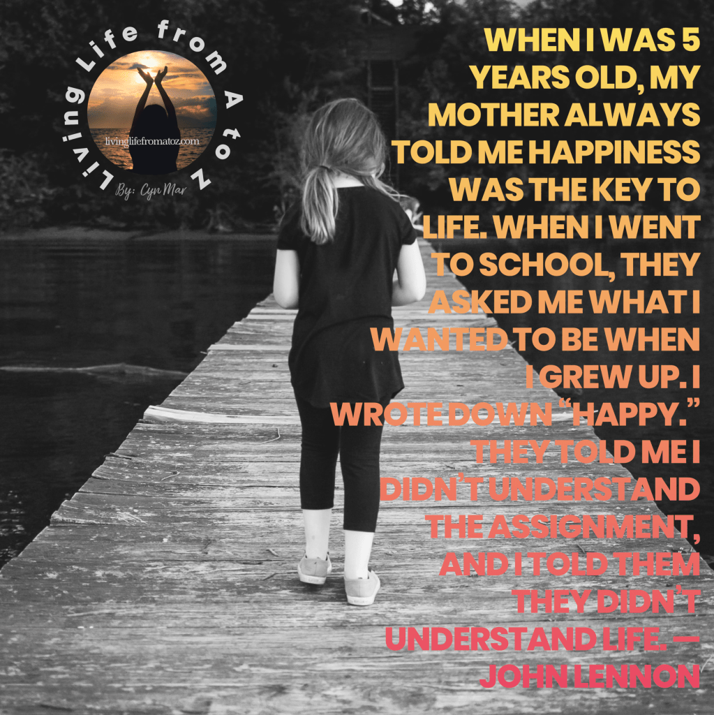 When I was 5 years old, my mother always told me happiness was the key to life. When I went to school, they asked me what I wanted to be when I grew up. I wrote down “happy.” They told me I didn’t understand the assignment, and I told them they didn’t understand life.