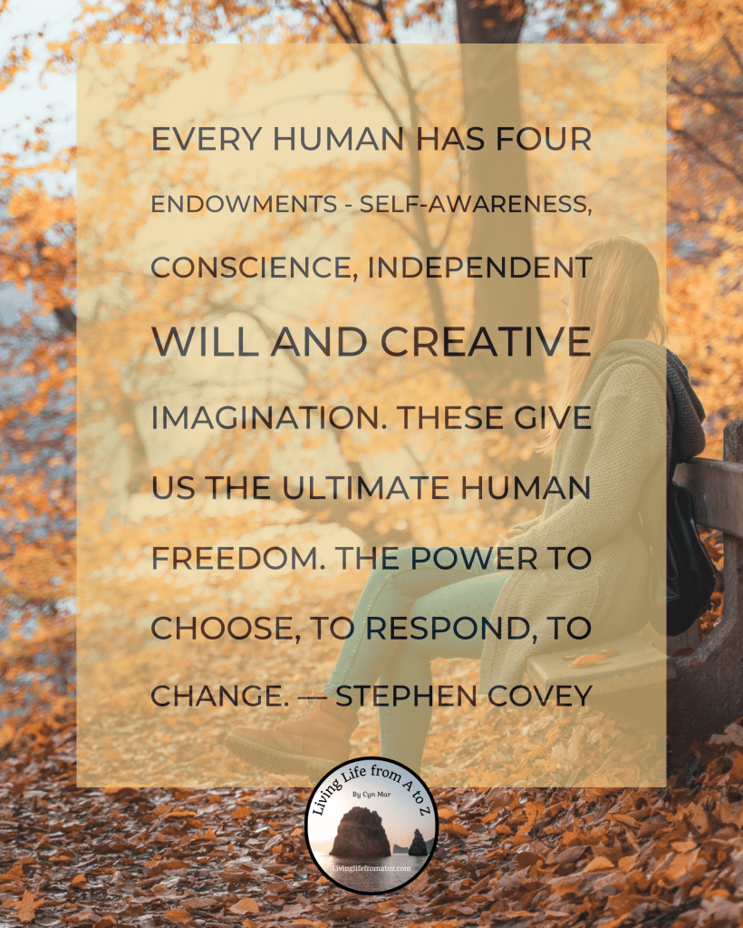 Every human has four endowments – self-awareness, conscience, independent will and creative imagination. These give us the ultimate human freedom. The power to choose, to respond, to change.